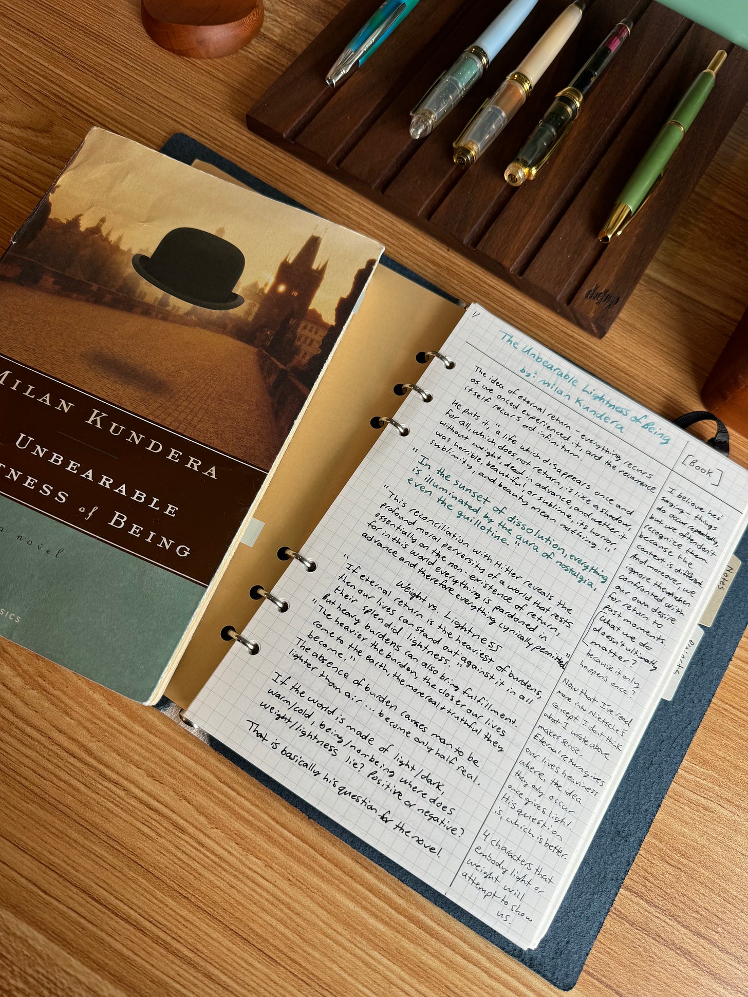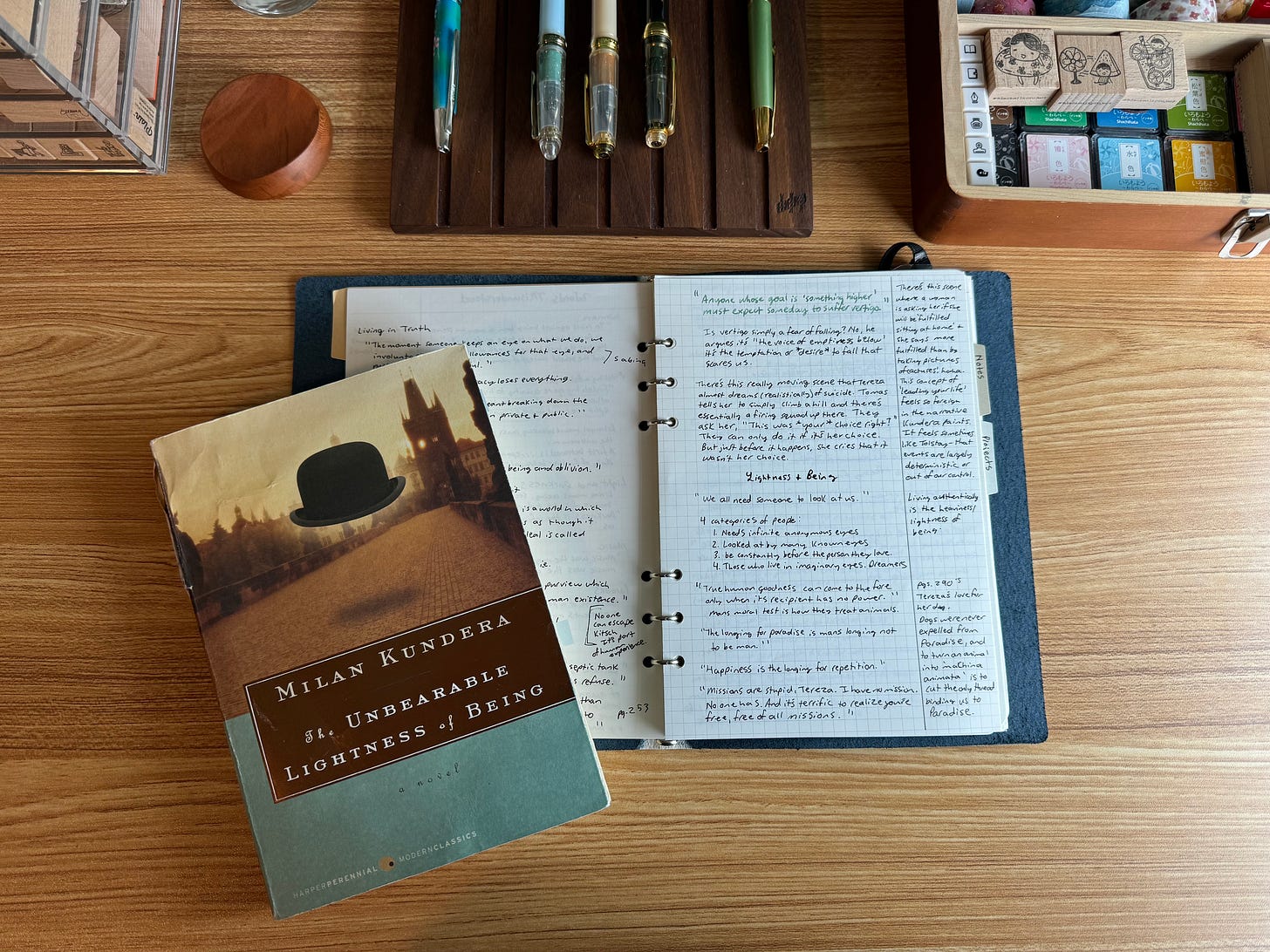 The Unbearable Lightness of Being was published in 1984 by Milan Kundera, a Czechoslovakian novelist. It’s written in the style of philosophical literary fiction, similar to Jean-Paul Sartre’s Nausea or Tolstoy’s War and Peace. That is to say, it inserts philosophical concepts or assertions in between and within the narrative.